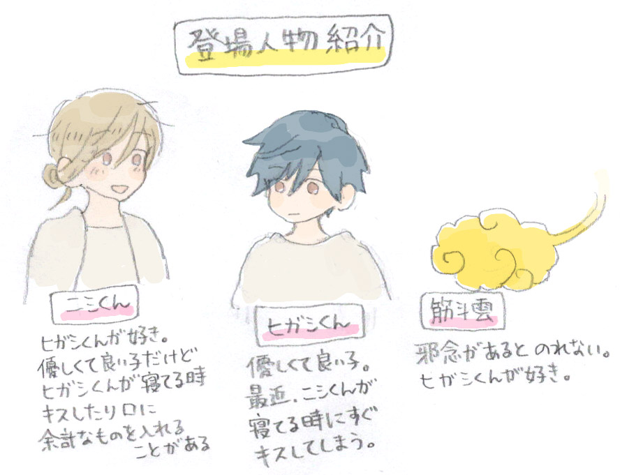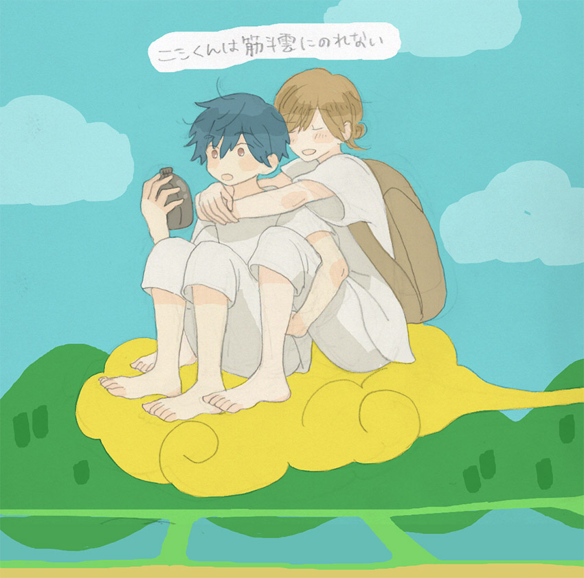 でも上の絵、ニシくんが筋斗雲に乗れないならこの体勢だときついよね…。本当はヒガシくんの膝の上に座るのがいいと思う。すごい邪魔だけど…