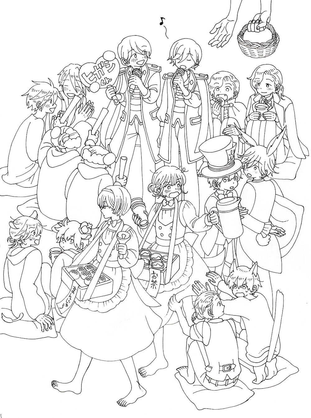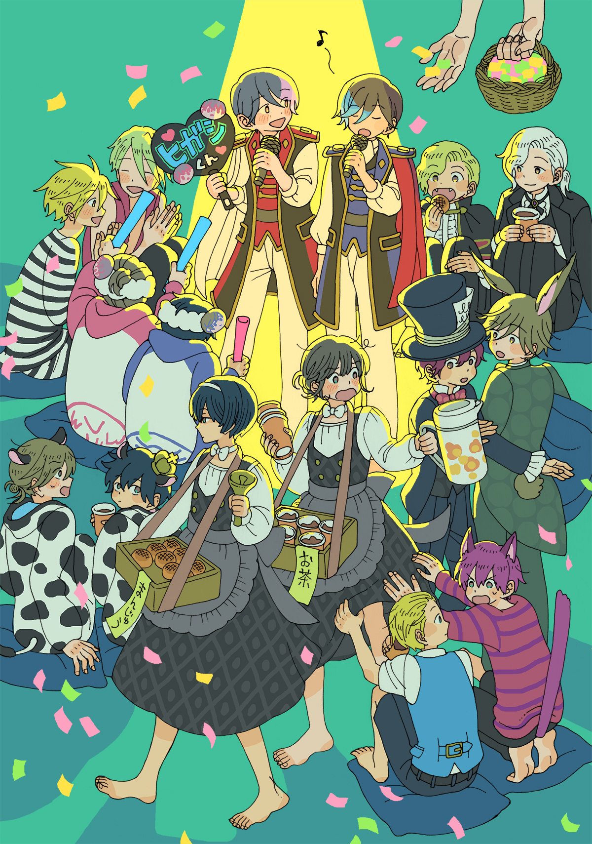 いろんなガチャ衣装のニシくんとヒガシくんが集まってワイワイしてる絵