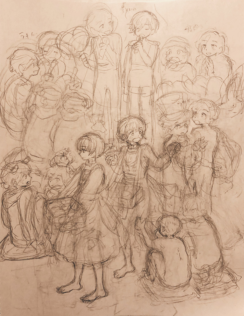 最初は床を畳で描いてたんだけど、なんか…どういうシチュエーションなんだ!?って思ってやめた。でも今思うとお疲れ様会みたいで良かったかも。アンロック大変だったし、お疲れ様会してほしいよ。。