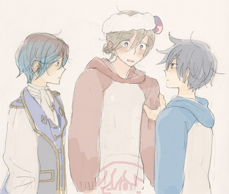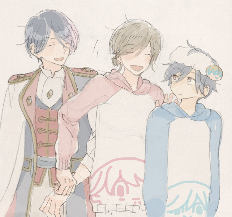 この下の絵は、上の絵を描いてる時、アイドルの2人を推してたり他の世界線の2人に沸いてる2人ってどうなんだろう…やや浮気なのでは…!?って気になってきて、自分を納得させるために追加で描いた絵です。