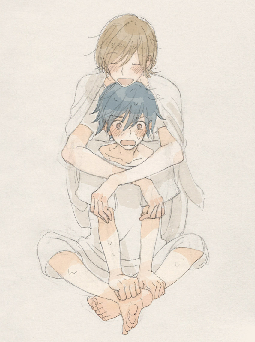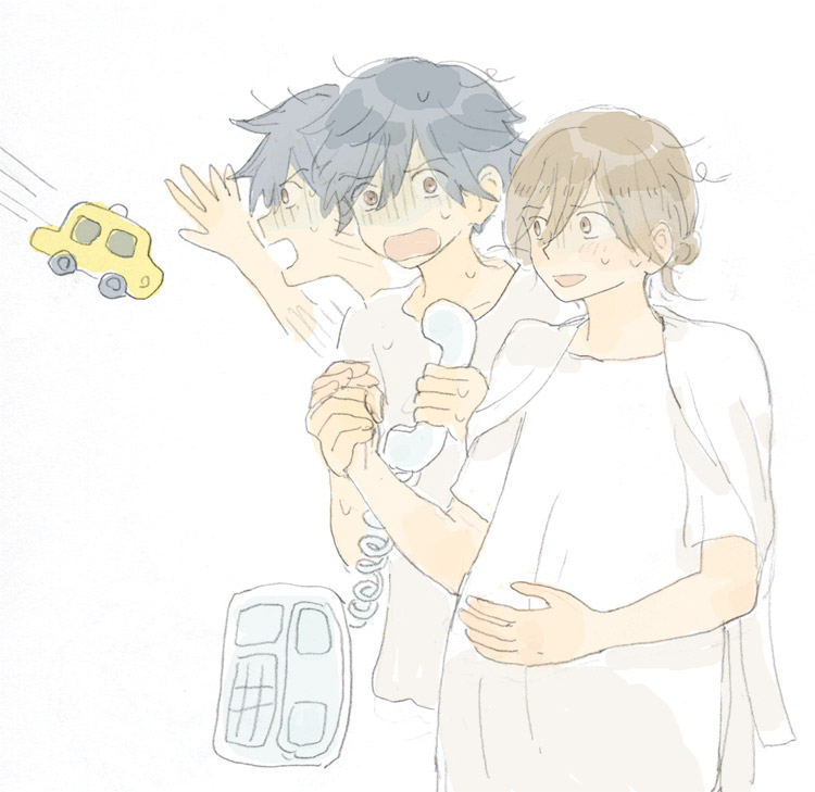 これは、ニシくんに足が痛いって言われてテンパってるヒガシくんが、妻が産気づいた夫みたいだったな…っていう絵です。