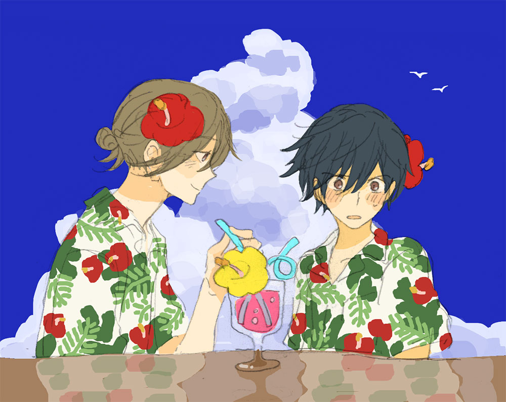 いま二つストローのジュースが来たら、ヒガシくんはドキドキしてうまく飲めないんじゃないかな~っていう絵です。