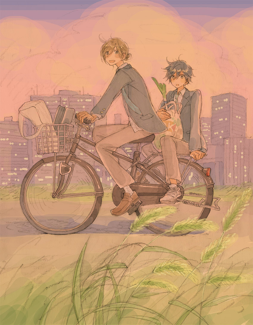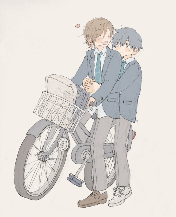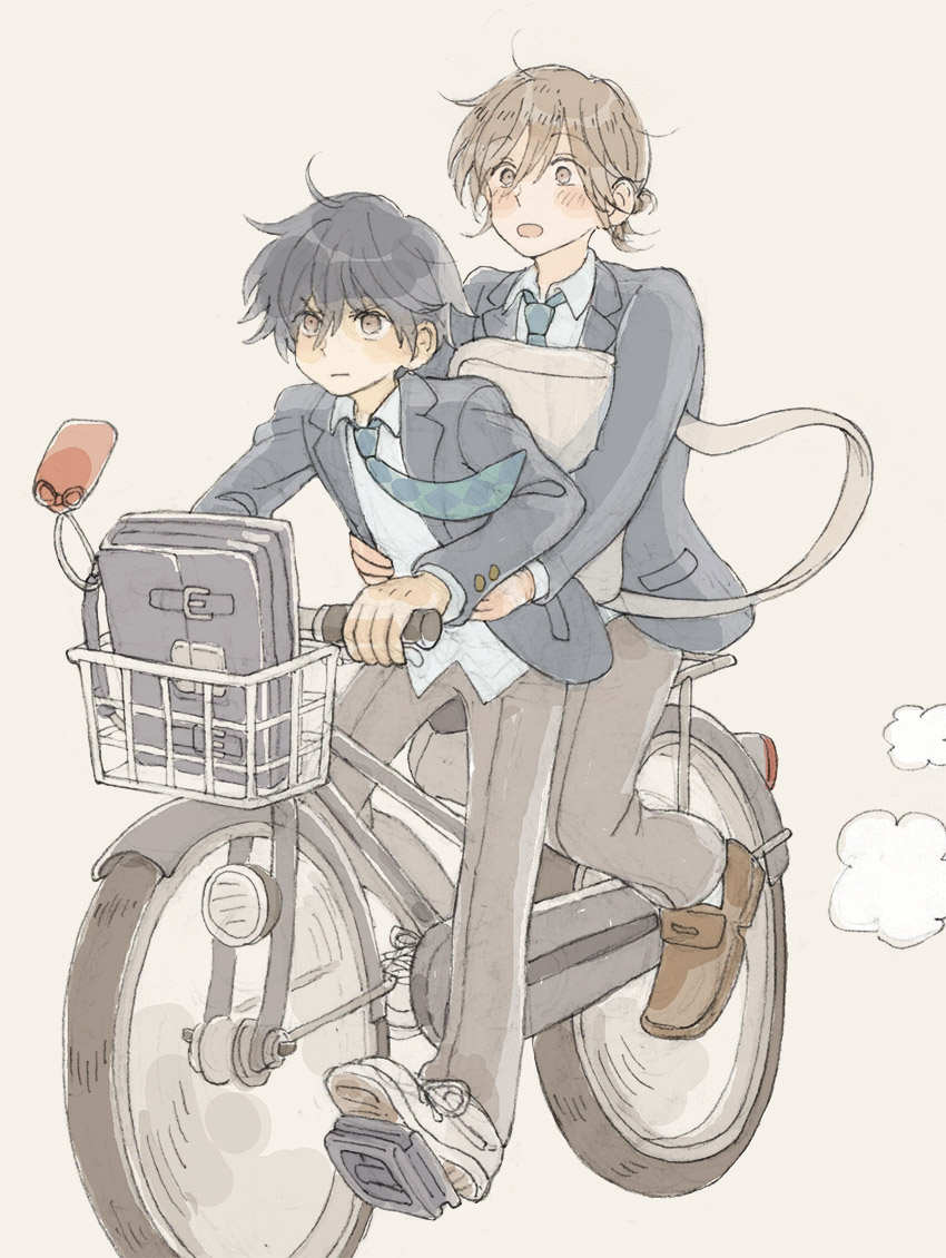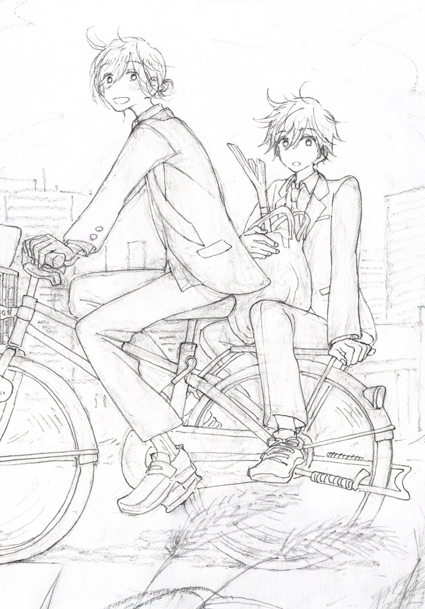 自転車がずーっと描けなくて、でも2人乗りしてるニシくんとヒガシくんがずっと見たかったから練習してヨボヨボ描いた…。