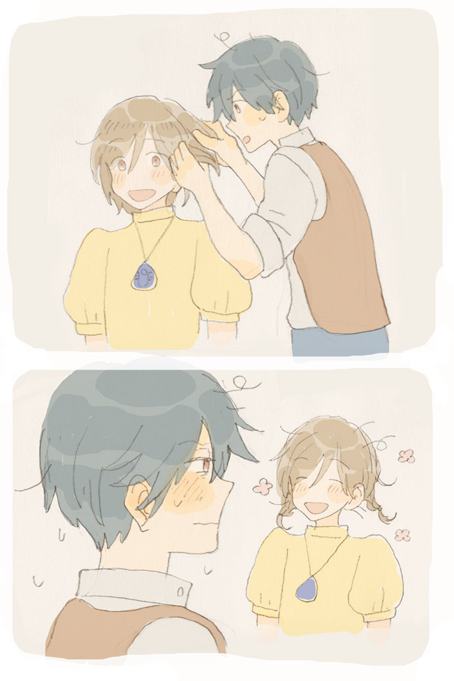 ヒガシくんに髪をやってもらうニシくん。