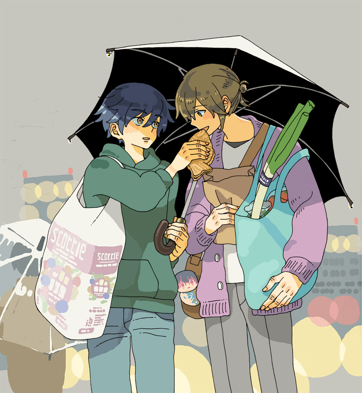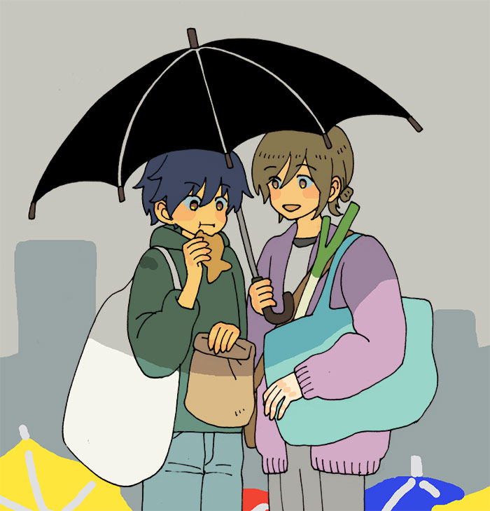 思い出の傘でスーパーにいくニシくんとヒガシくん。