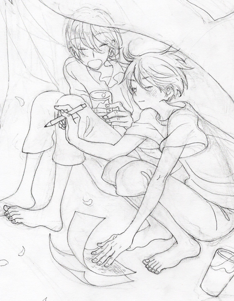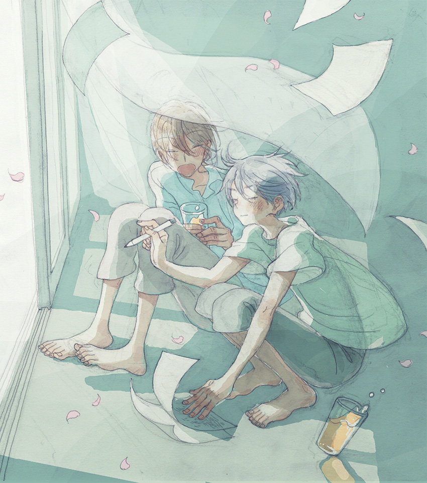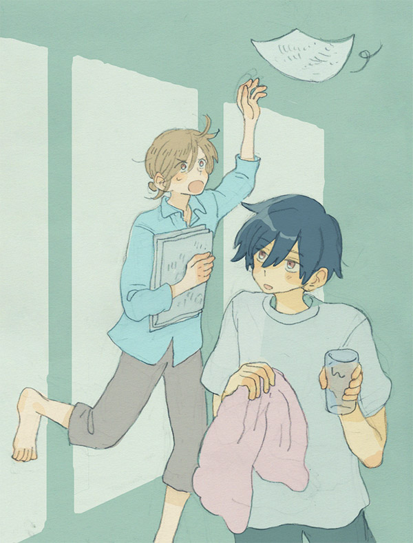 窓辺で絵を描いてたら急に突風がきて~みたいな絵です。