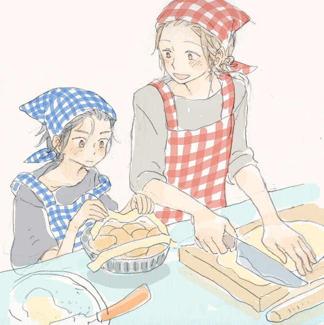 一緒にアップルパイを作っている大きいニシくんと小さいヒガシくん。