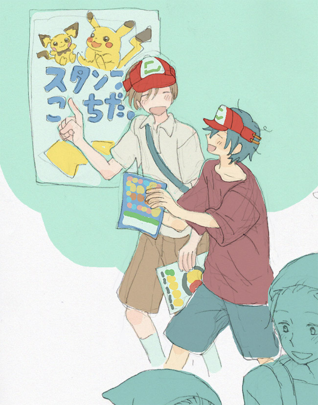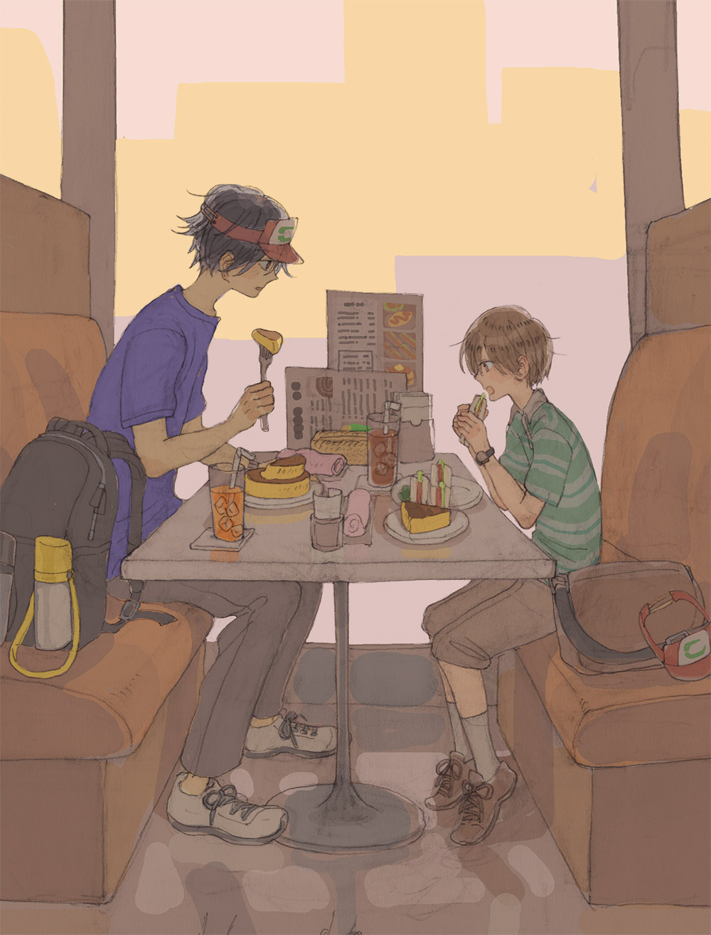 大きいヒガシくんと小さいニシくんが一緒にスタンプラリーに参加して、そのあとファミレスに行ってるところ。