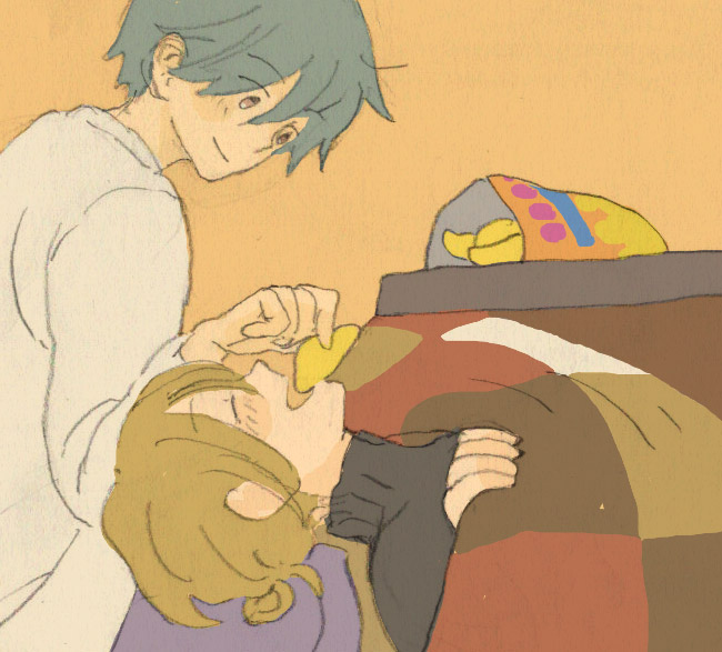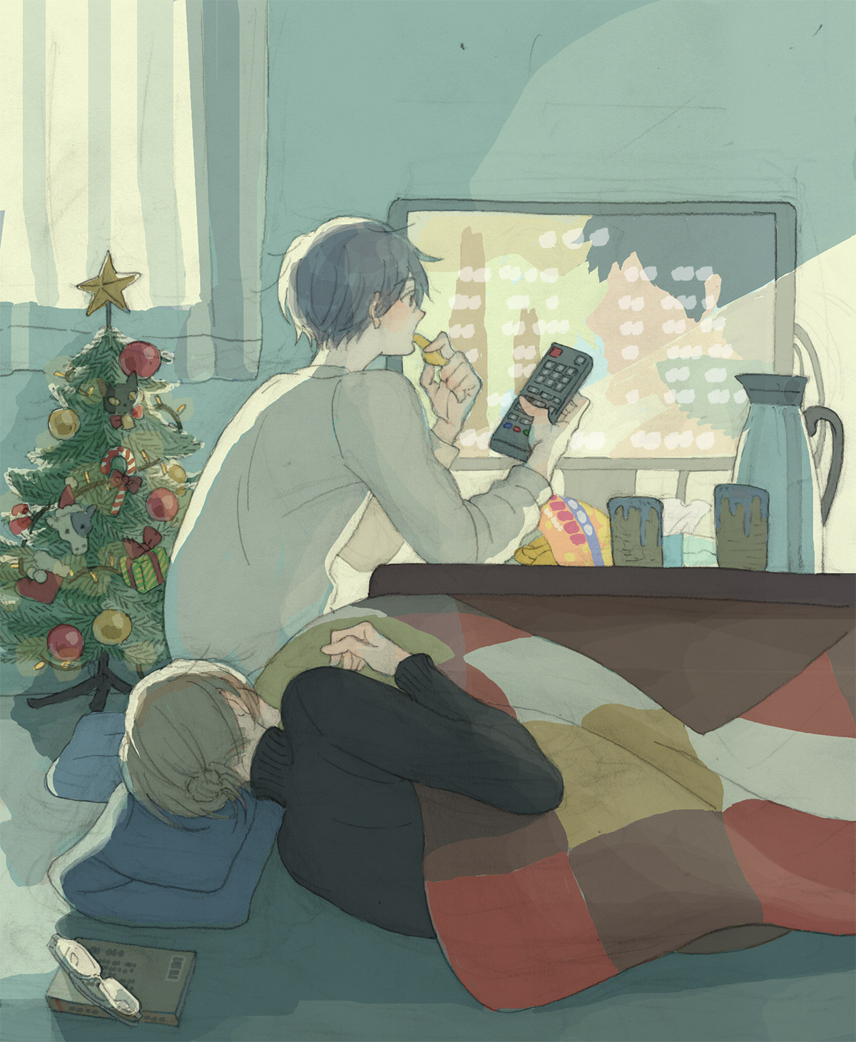テレビ見てるヒガシくんにくっついて寝ようとしてるニシくんです。