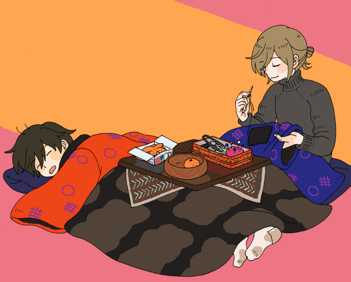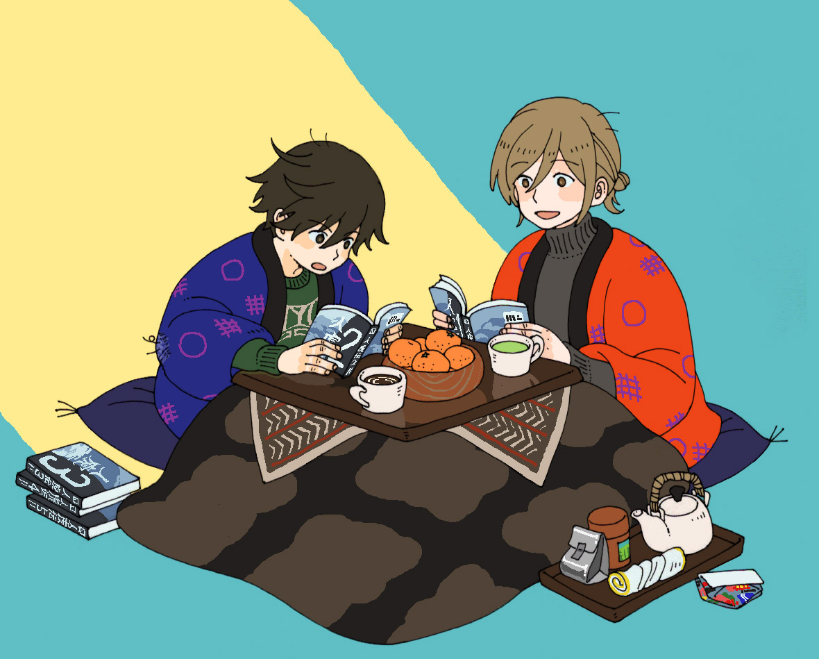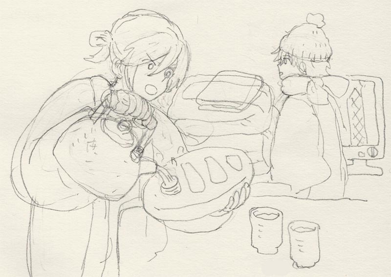 大寒波の時に描いた、寒さに備えるニシくんと、やりすぎじゃないかって思ってるヒガシくん。