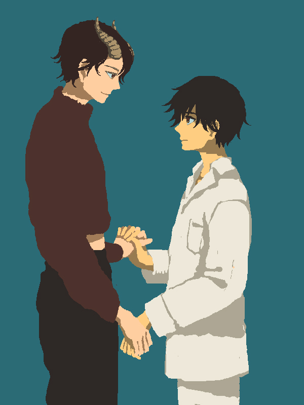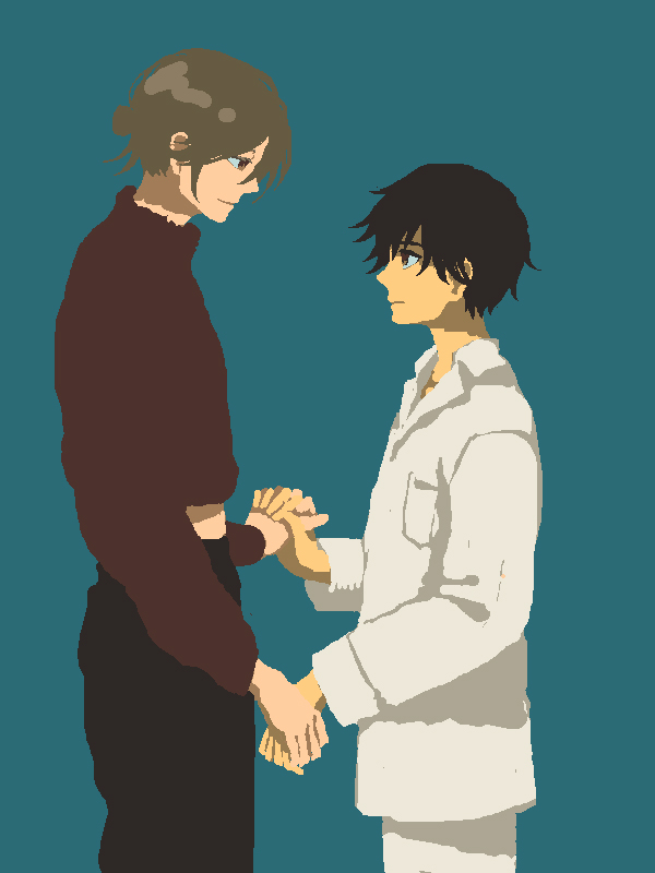 上の絵をあとで見たとき、この人だれ!?ヒガシくんにベタベタしないで!って気持ちになったから、いつものニシくんに直してかいた…。