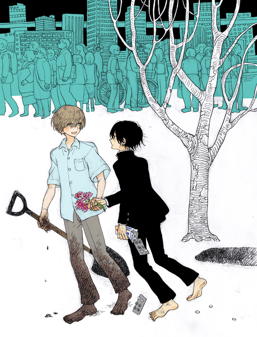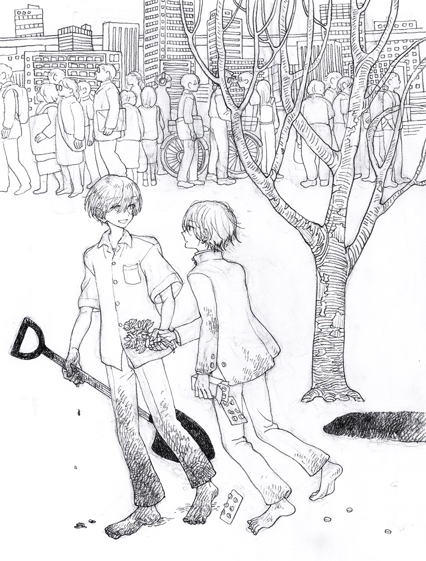社会から孤立して追いつめられるニシくんとヒガシくんの絵