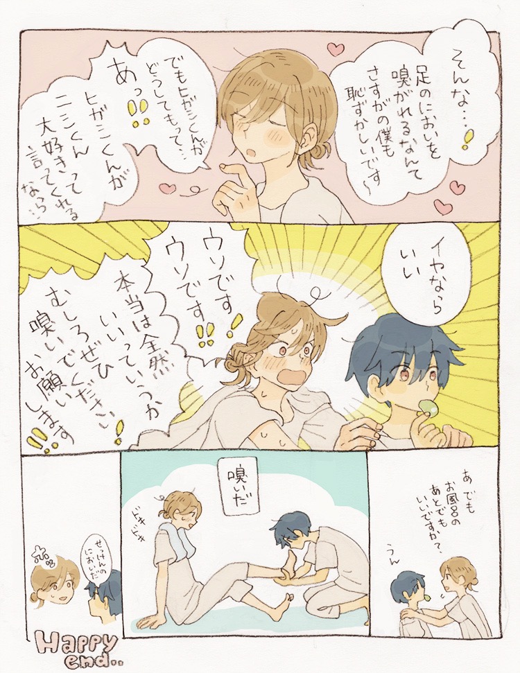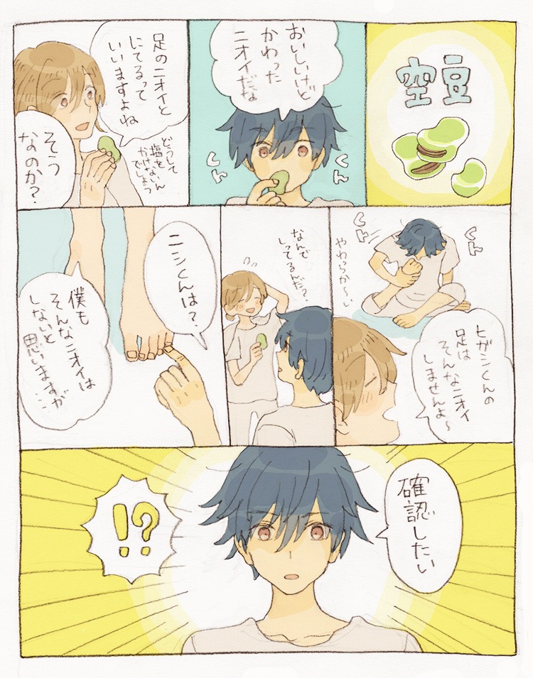 ヒガシくんがニシくんの足のにおいをかいでるのが描きたかった。。