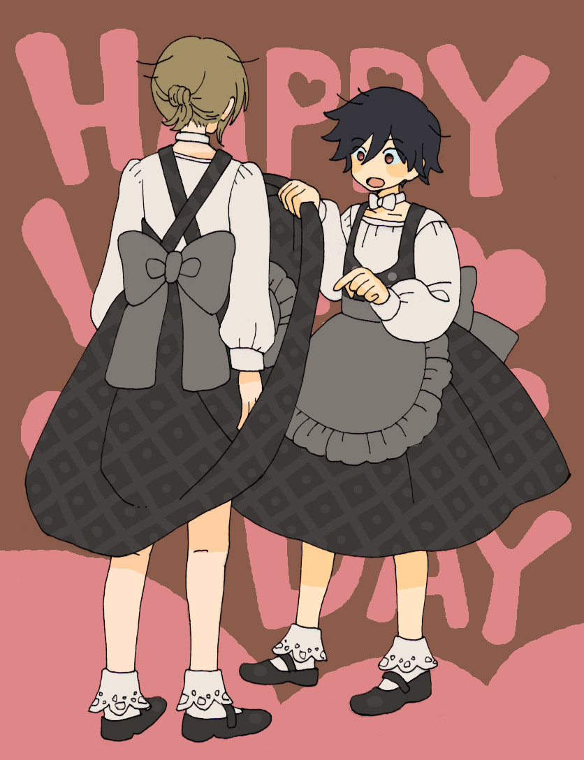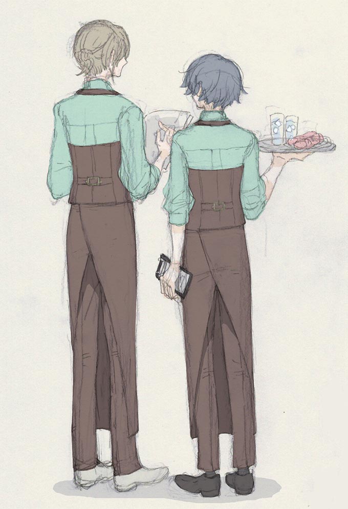 バレンタインの服、下がカフェエプロンで上のベストがホルターネックだったら後ろ姿がすごいいいんでは!って思って描いたやつです。