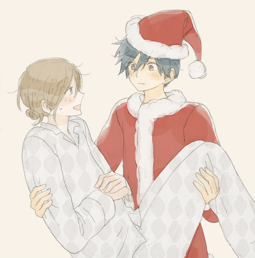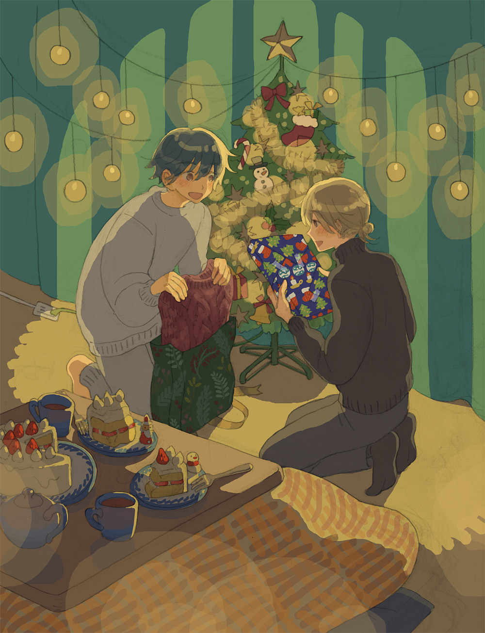 プレゼント交換をしてるニシくんとヒガシくんです。プレゼントはお互いにあげるから、もうサンタさんは必要ないみたいな…