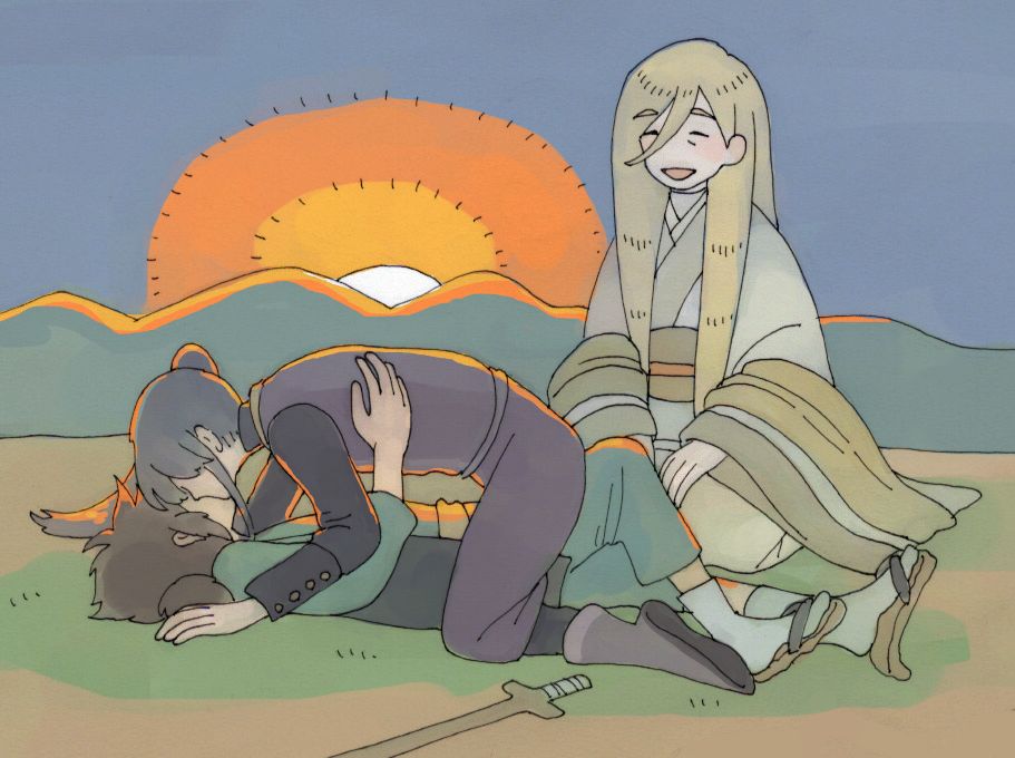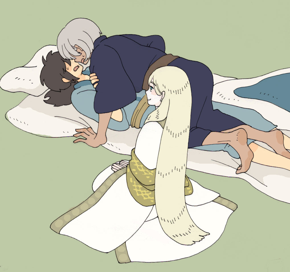 これはゲーム終盤で永羽様が、使いみたいに与の感覚を共有してたって話をしていたので(たぶん)、じゃあ、他キャラとのエッチなイベントもいつも永羽様と一緒だったんだなあ…という絵です。