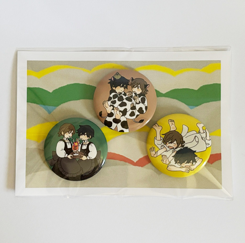 グッズもちょっとあるんだ~。これは缶バッヂ(3個セット)です。