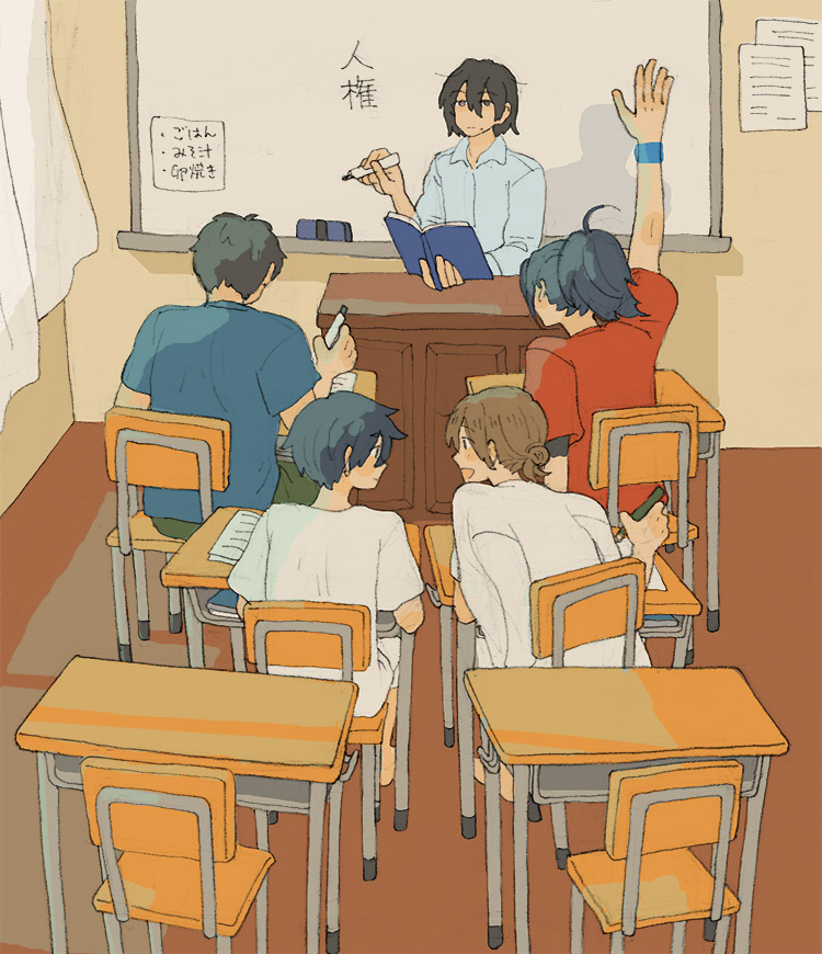 夜寝たらいつのまにか教室に座ってる、夢の中の学校みたいな感じがいいな~。皆で簡単なごはん作って(調理実習)、食べ終わったら目が覚める。